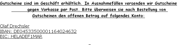 Wir möchten sie darauf hinweisen, dass die gesetzliche Gültigkeit für Gutscheine die älter sind als 01.01.2016 erloschen ist. Wir sind selbstverständlich bereit diese Gutscheine anzuerkennen bitten aber die Inhaber die Differenz zu den heutigen Preisen zuzahlen. Wir bitten um ihr Verständnis.